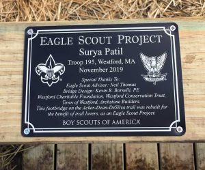 Troop 195 Boy Scout Surya Patil completed the Acker Trail bridge on the section of the town owned DeSilva property. Since this was town owned property, the bridge was required to meet ADA specifications for completion of this project.