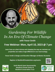 If you missed Trevor Smith’s Gardening for Wildlife webinar, a recording is now posted on Westford Climate Action’s website at https://westfordclimateaction.org/events/ under Past Events.