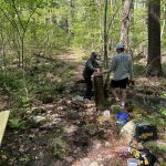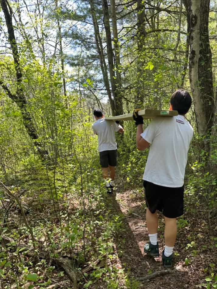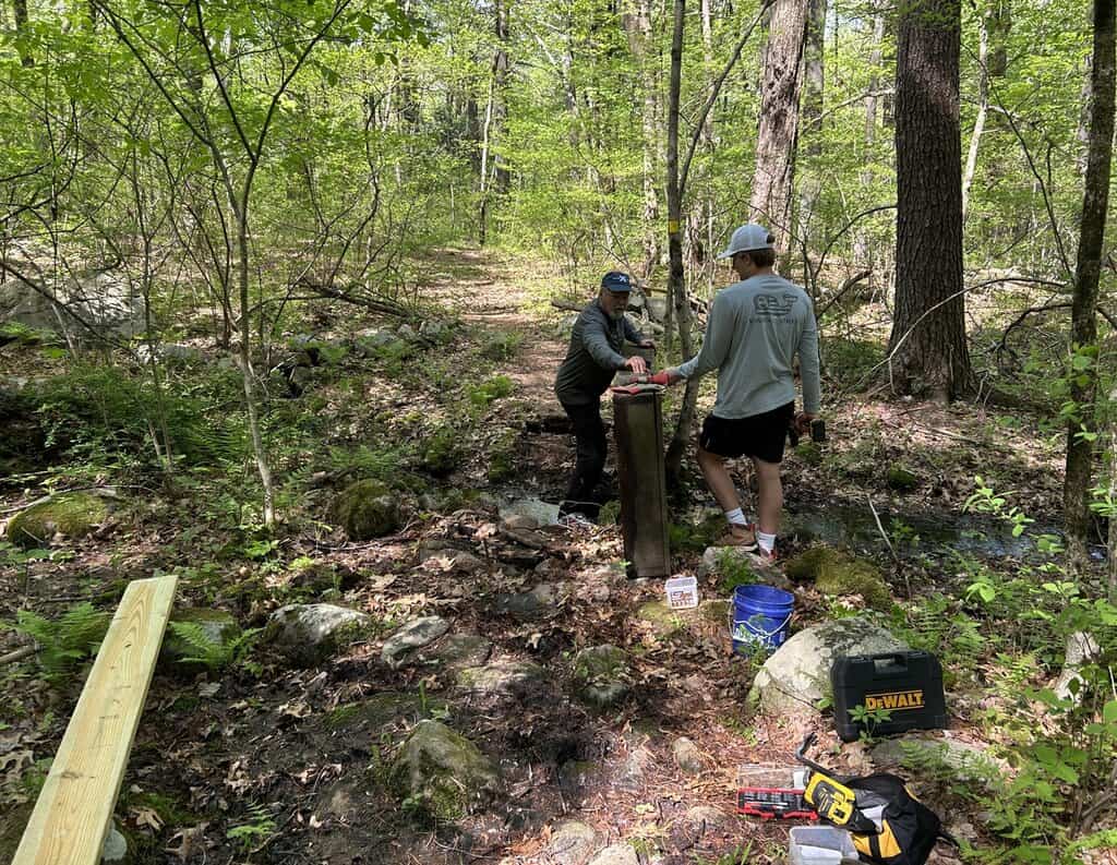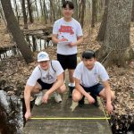 The Trust periodically works with Westford Academy seniors in April and May to teach environmental and conservation skills and, frankly, to benefit from some free labor. The six-week program this year is focused on trail structures. Ben Burgess, Connor Tsui, and Matthew Tsui are visiting and documenting the conditions of all trail bridges and boardwalks on Westford trails. Did you know that we have at least 95 such structures? They range from a few planks across a mud hole to 100-foot boardwalks to engineered bridges with footings and railings. Our three interns have so far been taking pictures of every structure and measuring the pieces that need replacement. Later in their Capstone tenure, they will purchase the wood, cut it to size, and bring it to the trail site to make the repair. That’s a lot of walking and carrying! Along the way, they will learn about trail maintenance, easements, Conservation Restrictions, and all the things the Trust does. The Trust gets a baseline of the condition of all trail structures, and Westford benefits from all maintainable structures being in top shape. Many thanks to our trust mentors on this project, Rich Strazdas and Gerry DiBello.