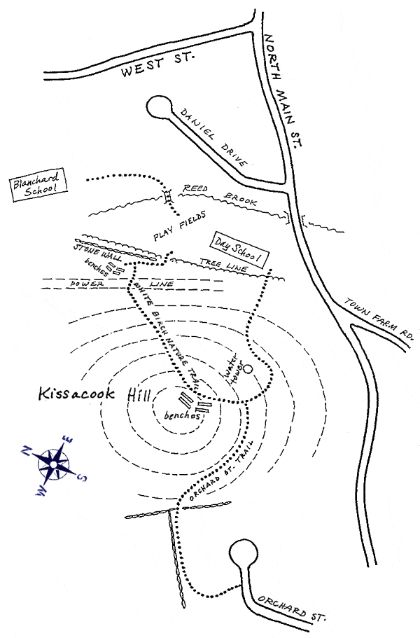 From here the trail runs fairly level to the south for a distance before turning east and back down the hill. In this area another trail leads off to the right (west) and extends down the other side of Kissacook Hill to Orchard Street in Forge Village, which may be explored at your leisure. (Feeling energetic? Continue to the Village View trails all the way to the VFW ball field.) Following the main trail will take you in short order to a large water tower where the trail can be picked up again between two small boulders near the tank and east of its access road. From here the going is a bit steep and some caution is advised especially if hiking with small children. The trail winds its way down the hill and ends in the front parking lot of the Day School.