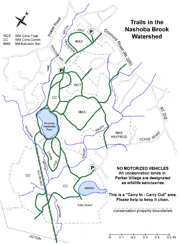 There are three parking areas to access this land. The easiest way to start is to park at the end of Trailside Way, which is off Powers Rd. across from Westford Earth Materials. Drive to the end of Trailside, half way around the cul-de-sac at the end, and then onto a short dirt road which leads to a town parking area and kiosk. Take the trail into the woods which will lead you to Nashoba (Kennedy) pond. You can circle the pond and back again for a fairly short walk of about two miles. The trail is fairly level around the pond. You will see other trails off of this one which you can explore, and you will also notice the Audubon land trails taking off from the northern side of the pond. Another place to park is in the Mass Audubon parking area on Concord Rd., across from Banbury Drive. From here, you can access one section of the Mass Audubon land, for a short loop walk to the west (about one mile), to Nashoba Brook and back. Or, you can continue straight ahead which will bring you to the parking area off of Trailside Way, and a trail into the Wilson Land. The Wilson Land can also be accessed by a trailhead on Preservation Way. The third parking area is near the end of Texas Rd., on the right. From here you can access the other part of the Mass Audubon land, crossing Nonset Brook on long bog bridges, built by Eagle Scouts, Ryan Dromgoole and Anthony Capriccio. Happy Trails!