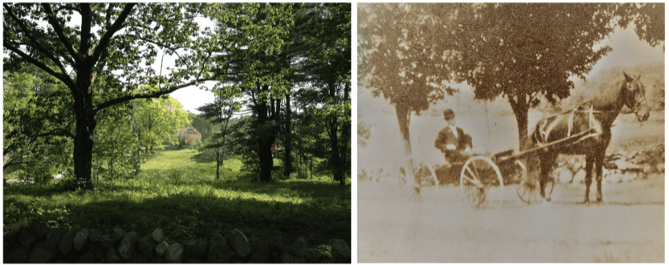 Located on Vose Road, once the main road to Acton, many sections are still a country dirt road. As you approach the farm on Vose Road from the west you will see Pond Brook flowing under the road. Here you will see a bypass for the horses to cross the brook and stop and get a drink from the brook and not block wagons passing on the narrow dirt road.