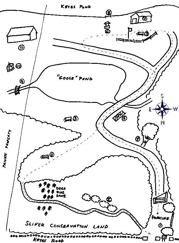 In 1987, the town acquired the Slifer property and made most of the property conservation land. The Slifer property was once a thriving, wonderfully landscaped property. Over the years, much of the landscaping has become overgrown. However, the property still features a variety of flowers, roses, and ornamental trees in addition to two sets of unbelievably huge, must-see, rhododendrons. (Late May or early June is the best time to see the rhododendrons in full bloom.) This property also features an abundance of wildlife, from a variety of birds to local Canadian geese and beaver families.