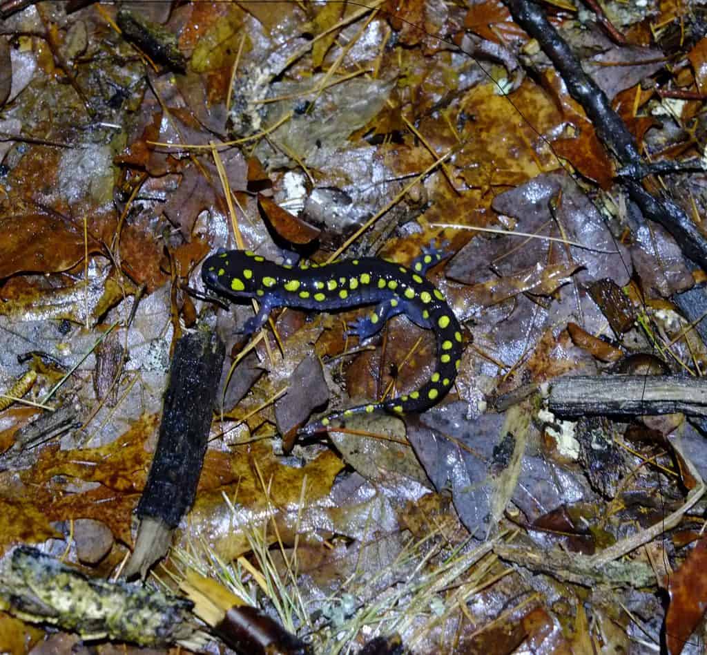 Photo of probable hybrid/jefferson blue spotted salamander was taken on March 18, 2021 near a vernal pool in Westford by Diane Duane.