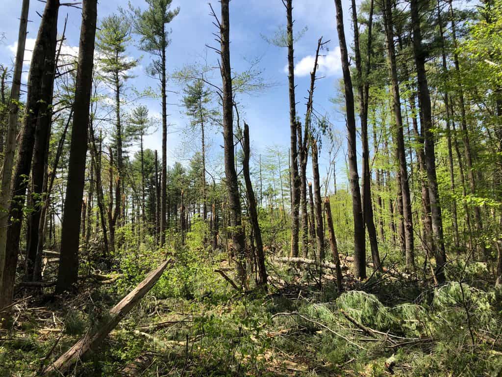 In May of 2020, northern Westford experienced a furious microburst of wind. It came on very suddenly and knocked down huge swathes of big old pine trees in its path. Our condo and some others were damaged by trees falling. The forest to the north of us which borders on Snake Meadow Brook and Keyes Pond was severely impacted. Trees in a defined path were uprooted and tossed down like Pick-Up Sticks. The forest looked like it had been hit by a bomb. Residents were understandably concerned. We could repair the condos, but what about the forest? Some people thought we should clear away all the downed trees, (several acres) and plant some young ones. I knew this was not the right approach, and fortunately, it turned out to be much too expansive to do.