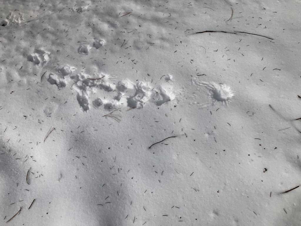 This winter has been very mild in general, but we have had a few snowstorms. When there is snow on the ground, I love to go out looking for animal tracks. Around here, the most numerous are squirrel tracks and rabbit tracks. White-tailed deer are quite often seen, and its always a surprise to see that the deer have come right up into the front yard at night. Also fairly common are fisher and coyote tracks. The most fun is when you come upon a “track story” in which two animals have encountered each other. Recently I saw a track story in our front yard. It seems that a squirrel was hopping along into the yard from the woods, and then was swooped down on by a bird. The bird must have been successful in catching the squirrel because the squirrel track ended right where the birds’ wings hit the ground. I took a photo of this “story” in which one can see the squirrel tracks in the fairly deep snow, and the imprint of wings at the end of the track. It doesn’t look like it was a very big bird, perhaps a small owl, but it fed its hungry stomach that night.